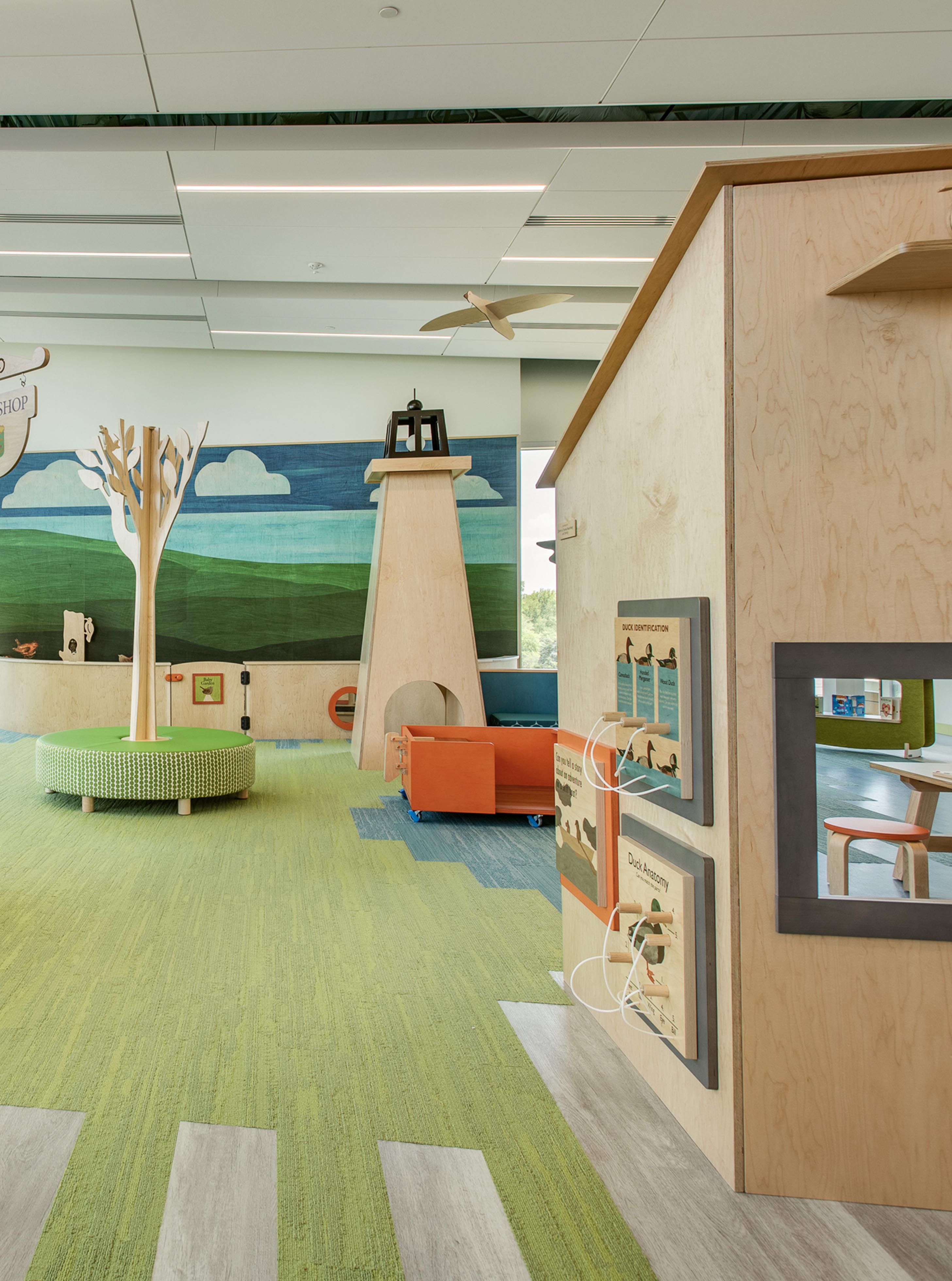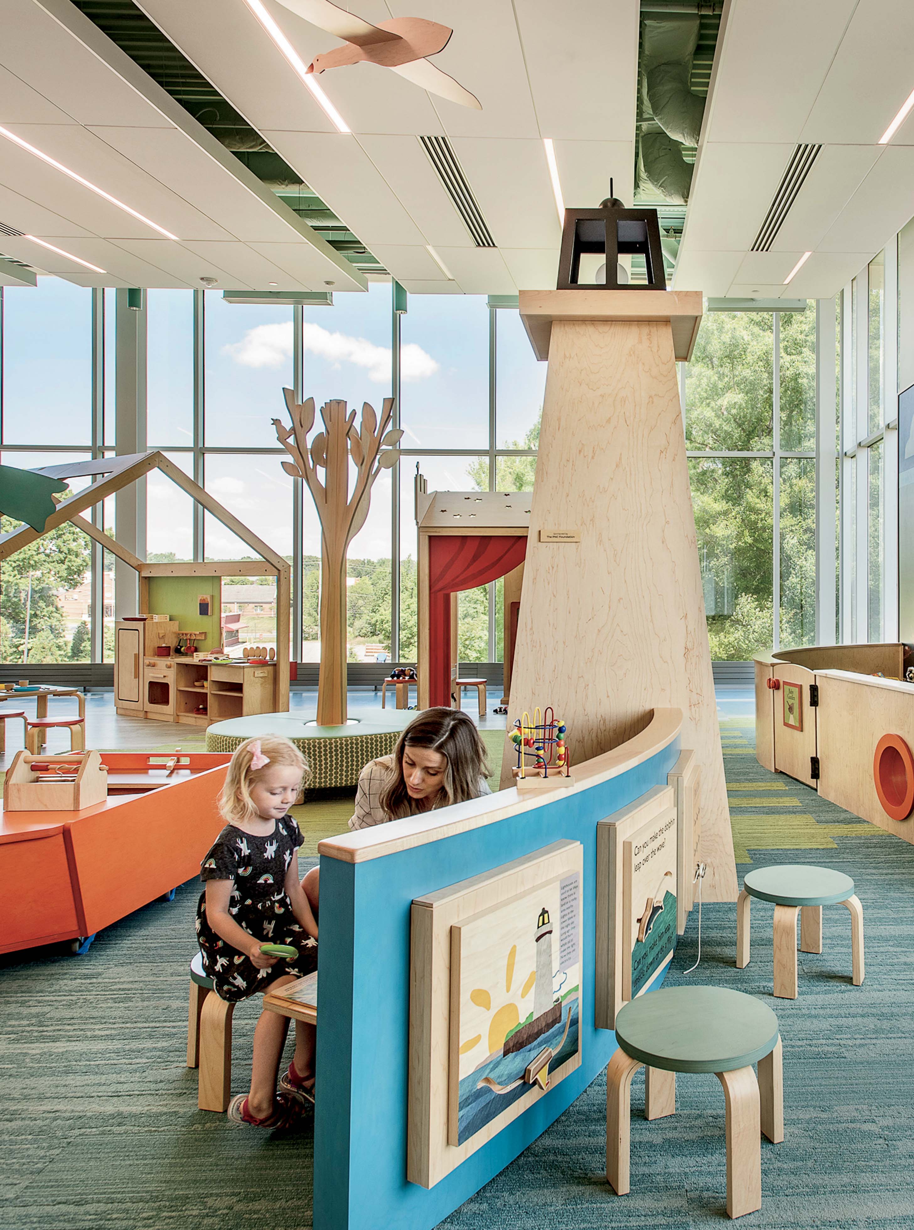 The desk was designed in collaboration with library director and single mother Barbara Weedman, using components from TMC’s Learn/Play early learning systems.