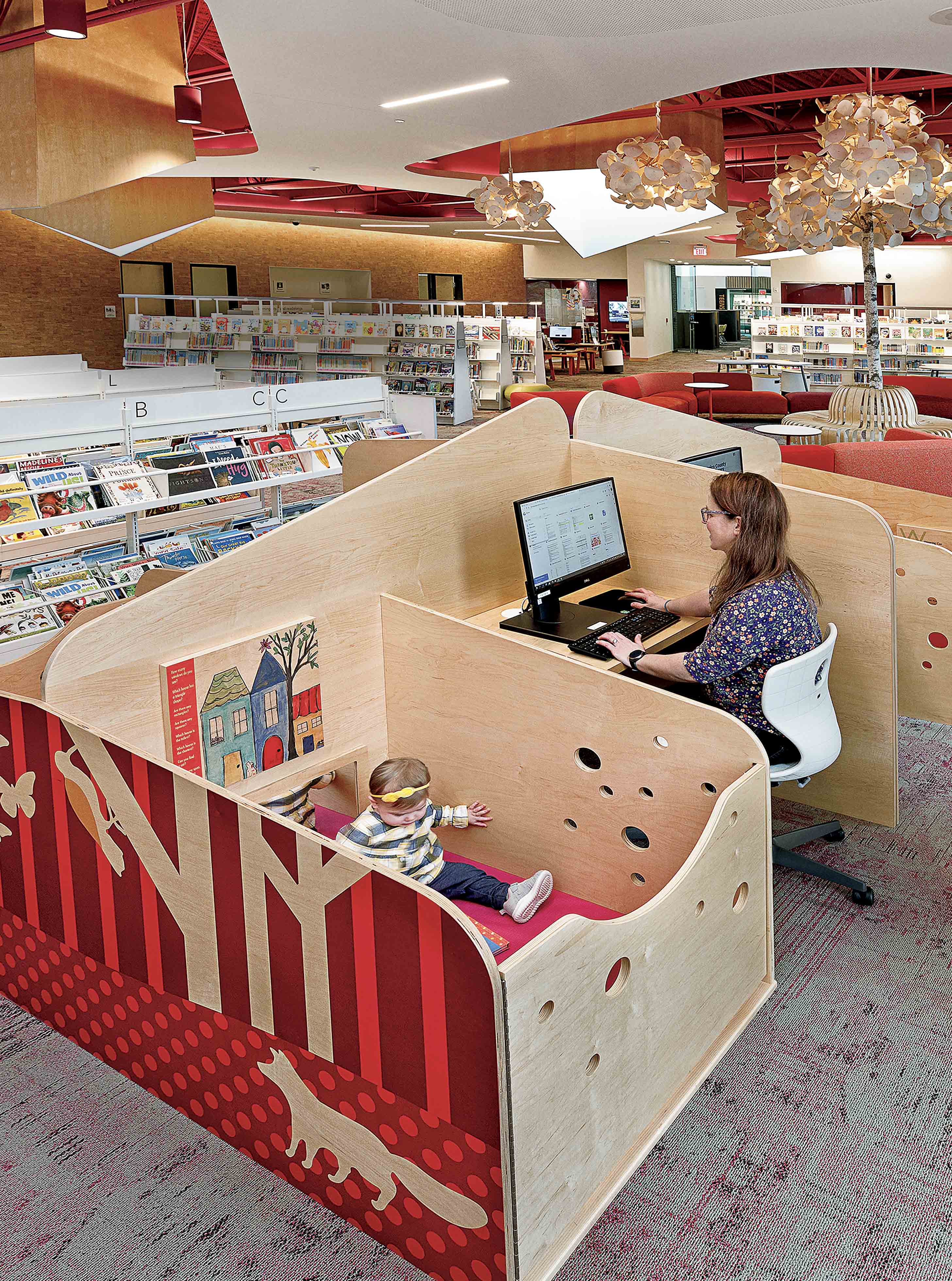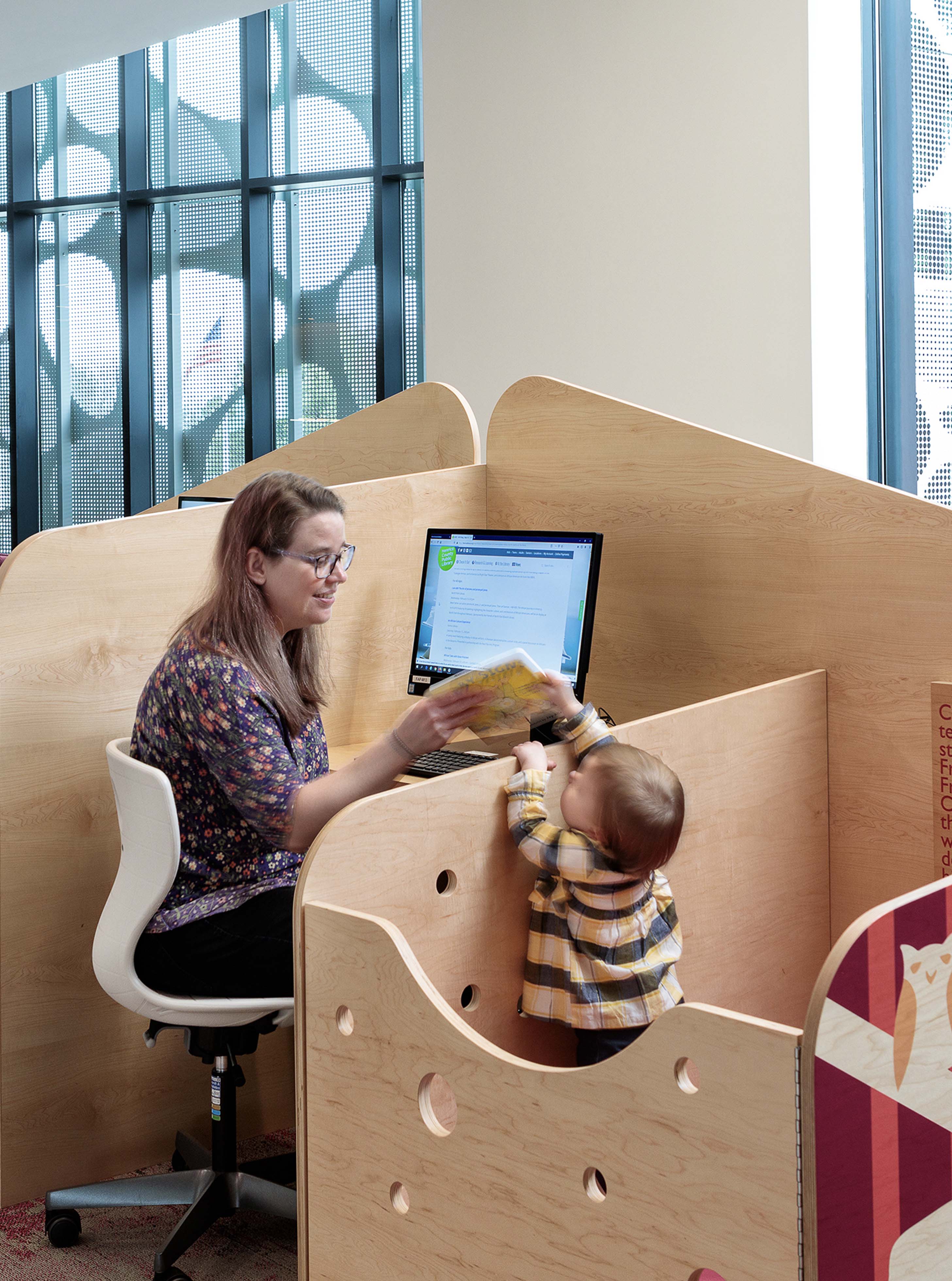 You also might have caught it on social media. The Parent+Child Carrel went viral in January 2022 after someone spotted it at Fairfield Area Public Library near Richmond, Virginia. It’s a desk that’s connected to an enclosed play area, enabling a caregiver to work while a child plays adjacent, making libraries a more inclusive and effective public space for working parents.