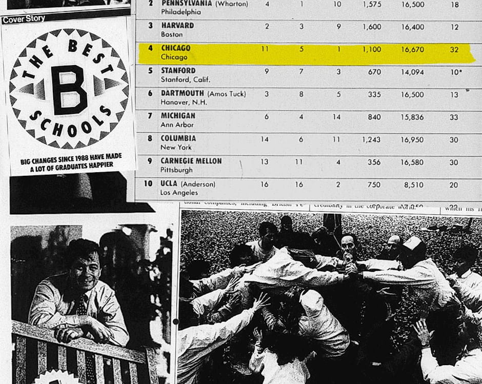 The late 1980s were a scary time to be enrolled at Chicago Booth. Students had left jobs to attend what they considered one of the best, if not the best, business school in the country. They planned to move on to big corporate careers, many of them in finance. Then, on October 19, 1987—what came to be known as Black Monday—the stock market recorded its biggest single-day drop in history, losing 22.6 percent of its value, $500 billion. The following October, BusinessWeek (now Bloomberg Businessweek) came out with a survey ranking Booth as No. 11 among business schools, not even in the top 10. The school’s curriculum got a D and its professors got a C.