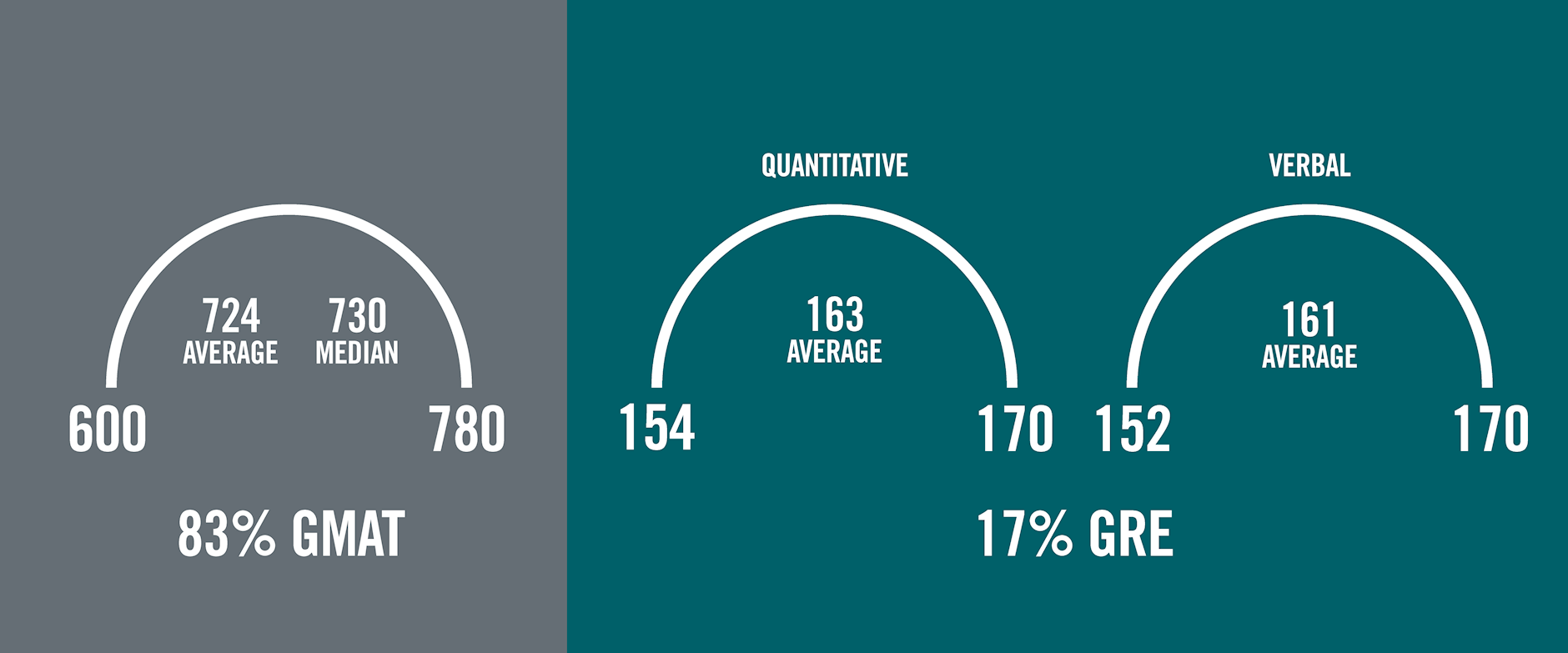 4 Test score ranges reflect the 80% range. Full GMAT score range is 200-800; Full GMAT Focus score range is 205-805; Verbal Reasoning and Quantitative Reasoning measures of the GRE General test is 130-170. Percentages do not total 100 due to alternate testing requirements for University of Chicago affiliated and joint degree applicants.