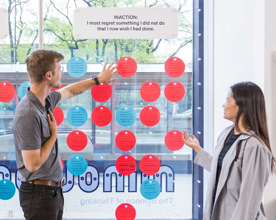 This exhibit gives visitors two different time frames to consider: the recent past, and their entire lives. By asking visitors to share and reflect on their regrets, a pattern of data appears that reflects the findings of psychological research into the nature of how people understand actions and inactions over the course of their lives.