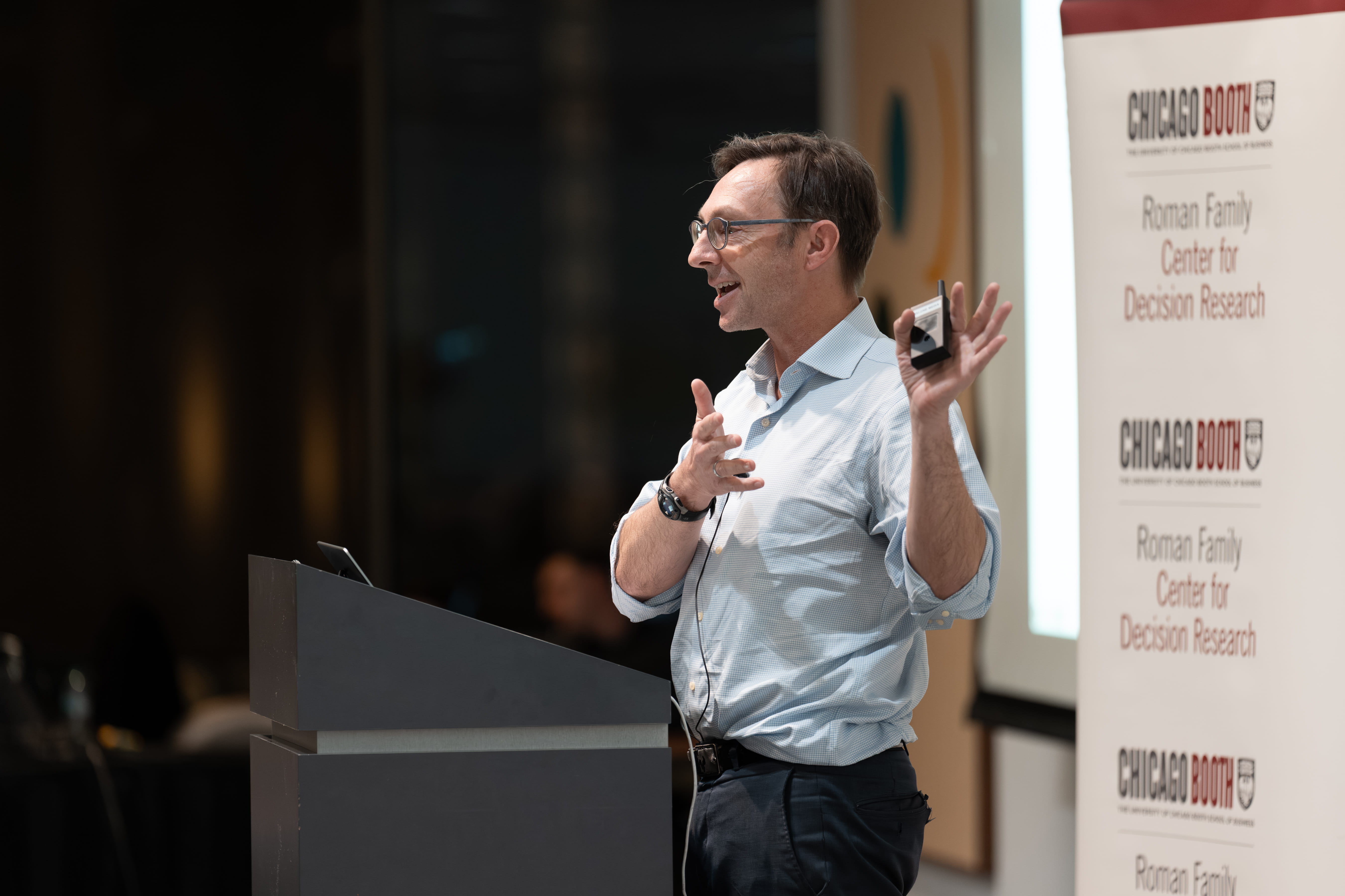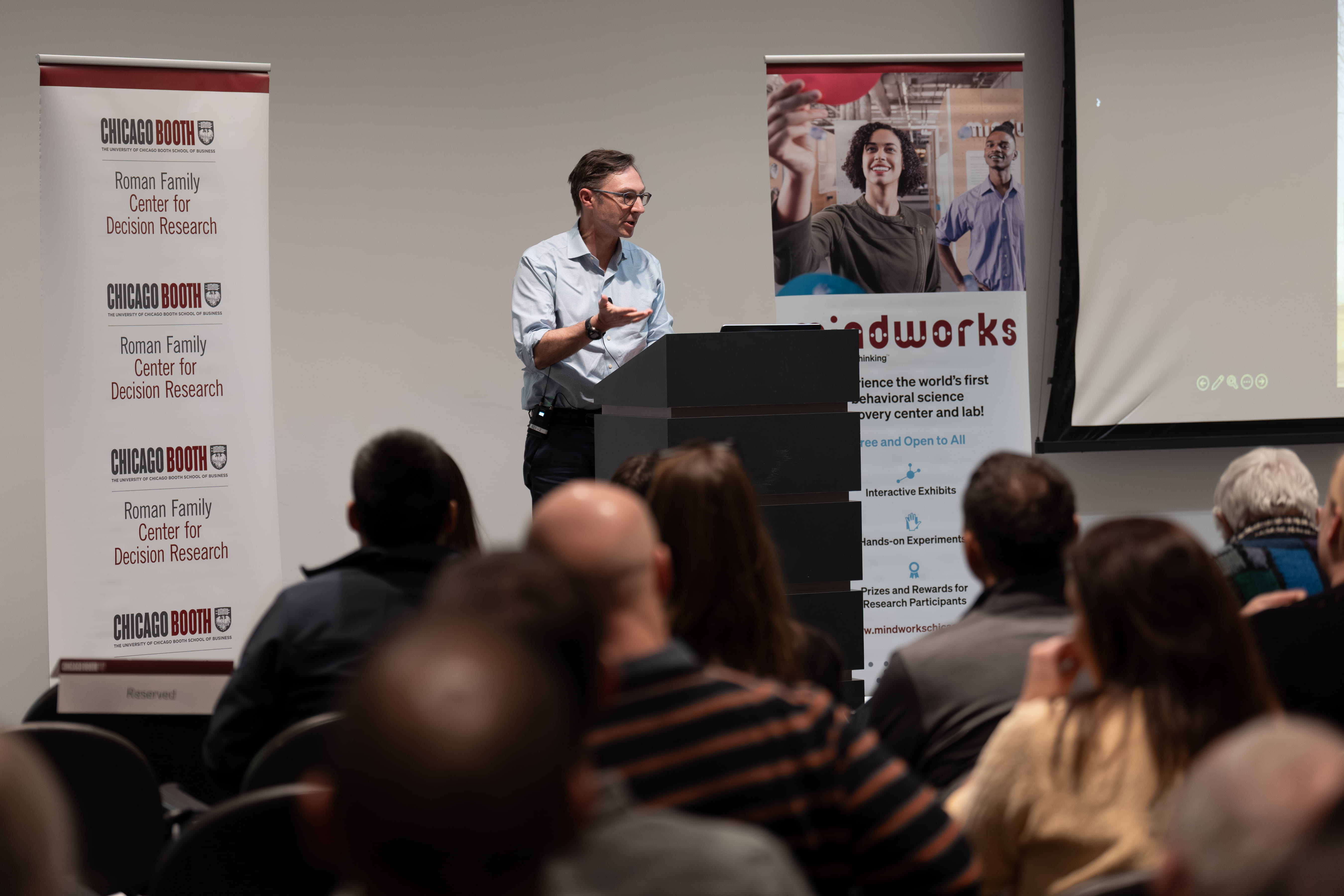 - [George Wu] I am George Wu. I am the John P. and Lillian A Gould professor of Behavioral Science here at Booth. I wanna say a little bit about Think Better. So some of you have been here before. We have a public lecture series. It's hosted by the Roman Family Center for Decision Research, which I'll talk about in a second. But the purpose of this series is to explore how insights from behavioral science affect policy, affect society, shape policy, impact business, and improve the lives of all of you. The Think Better series is just one of many activities that the Roman Family Center for Decision Research pursues in support of the behavioral sciences. In addition to this, these are scripted words, so I'm saying it, in addition to our terrific faculty. Our center also supports many young scholars and postdocs in the field, runs workshops and Brownbag series. The Center is also the home of our PIMCO Decision Research laboratories, which conducts groundbreaking behavioral science research at Mindworks, Our campus in Hyde Park and online in the virtual labs and throughout the city in our popup labs. So you may get an invitation to participate in one study. If you haven't been, I invite you to go to Mindworks, which is 300 or so, South Michigan, [Note: The correct address is 224 South Michigan Avenue.]