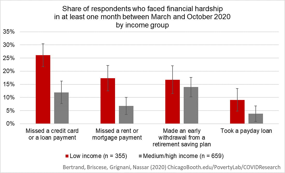 Americans are experiencing financial hardship due to the crisis. Among low-income households, 17 percent have missed a rent or mortgage payment and over a quarter have missed a credit card or a loan payment since the start of the pandemic. Across income groups, about 15 percent of the families in our sample have withdrawn from their retirement savings, potentially undermining their future financial stability. A smaller but significant portion of families have taken payday loans (about 9 percent and 4 percent, respectively), short-term unsecured cash advances often characterized by high interest rates.