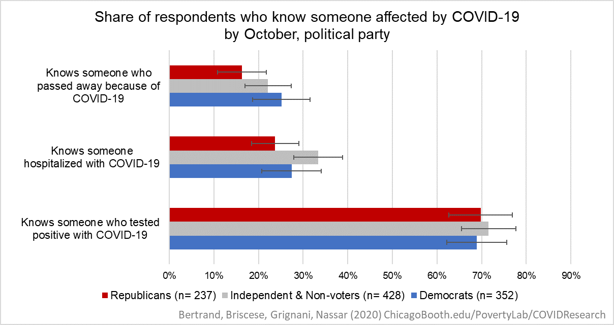 Note: The chart shows the share of respondents, according to their political affiliation, who know someone who tested positive with COVID-19, someone hospitalized with COVID-19, and someone who passed away because of the virus between February and October.