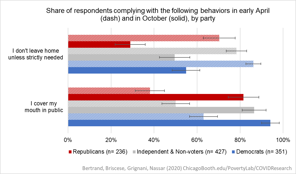 Note: The chart shows the share of respondents who report complying with two preventive measures - not leaving their homes unless strictly needed, and covering their mouths while in public, in early April (dash bars) and October (solid bars). We separate respondents according to their party affiliation.