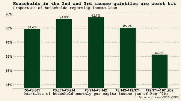 [6] Pre-lockdown income is measured by a household’s total income in February, 2020. Per-capita income is computed as total household income / sqrt(household size). The computed quintiles correspond to Rs.0–Rs.3,801, Rs.3,801¬–Rs.5,914, Rs.5,914–Rs.8,142, Rs.8,142–Rs.12,374 and Rs.12,374–Rs.101,902 respectively. Care should be taken in attaching labels to these groups. For example, though the quintile ranging from Rs.5,914–Rs.8,142 is the middle quintile, it may be misleading to describe these households as middle-income or middle-class. Similarly the highest quintile starts at Rs.12,374 per-capita per-month, which again does map well to commonly held notions of what the “richest” households in India might be.