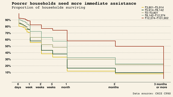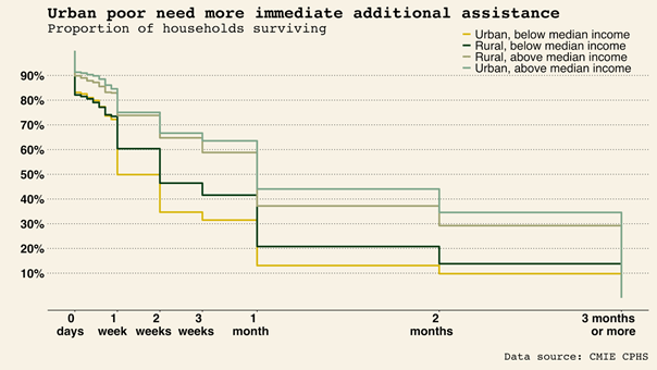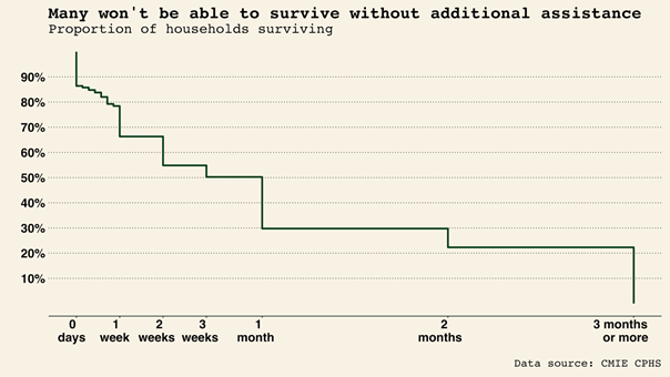 Given the low baseline wealth of many households, a very large share of Indian households state that they will be unable to continue — even over relatively short periods — without additional assistance. Across India, 34 percent of all households report being able to survive for no more than one week without additional assistance.