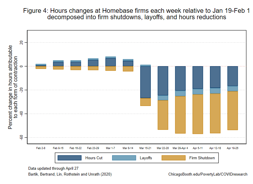 One important caveat to this decomposition is what we refer to as a firm shut-down is a shut-down of Homebase measured employment. If firms employ workers that do not schedule their time using Homebase and some of these workers remain employed, some of the hours losses that we attribute to shut-downs may instead be properly attributed to layoffs.