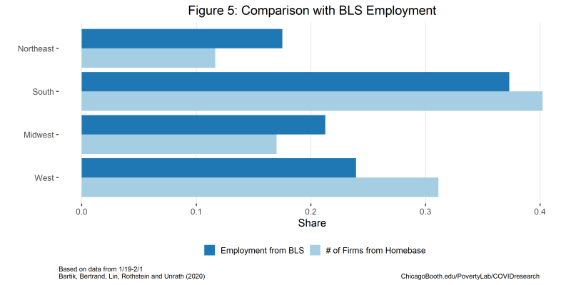 This figure shows the share of Homebase firms located in each Census region (in light blue) and compares these shares to each region's share of total employment (in dark blue), as measured by the Bureau of Labor Statistics (BLS) data.  Homebase firms are somewhat concentrated in the West region and less concentrated in the Northeast and Midwest than overall employment.