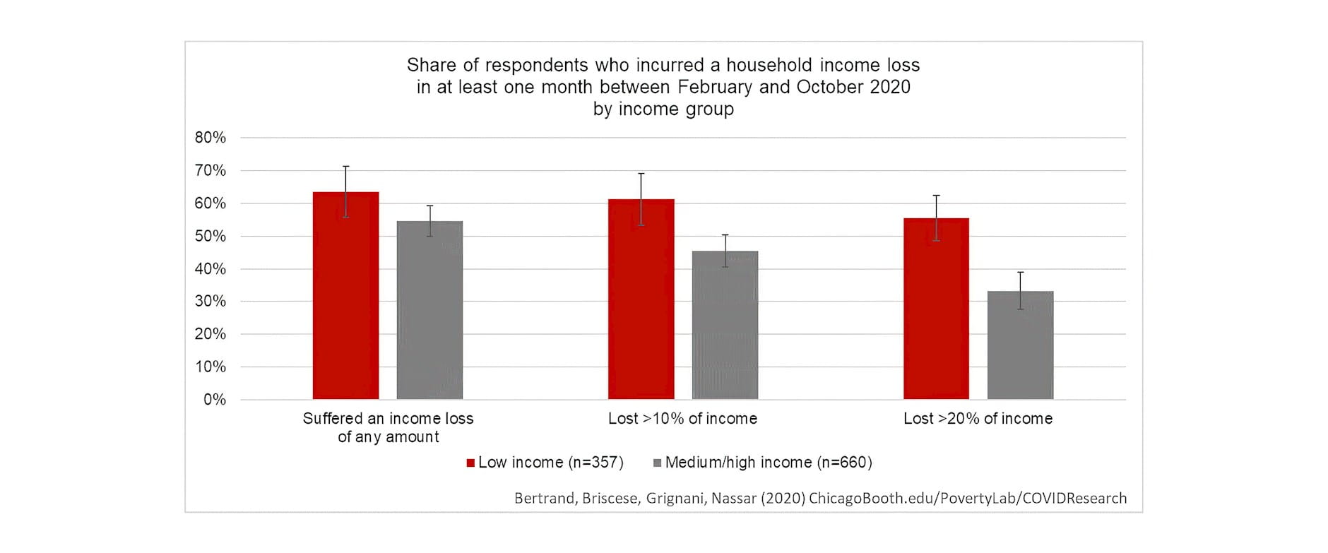 Note: The chart shows the share of respondents who incurred an income loss at the household level in at least one month between March and October 2020. The shocks are calculated with respect to the self-reported income in February. Household income is adjusted by household size.