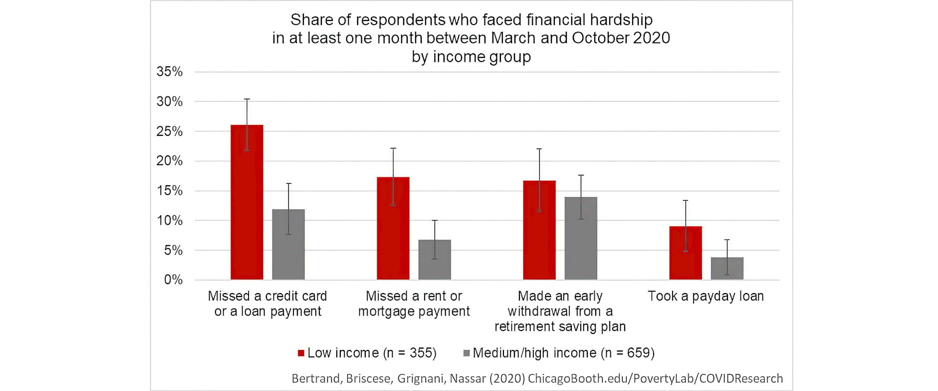 Americans are experiencing financial hardship due to the crisis. Among low-income households, 17 percent have missed a rent or mortgage payment and over a quarter have missed a credit card or a loan payment since the start of the pandemic. Across income groups, about 15 percent of the families in our sample have withdrawn from their retirement savings, potentially undermining their future financial stability. A smaller but significant portion of families have taken payday loans (about 9 percent and 4 percent, respectively), short-term unsecured cash advances often characterized by high interest rates.