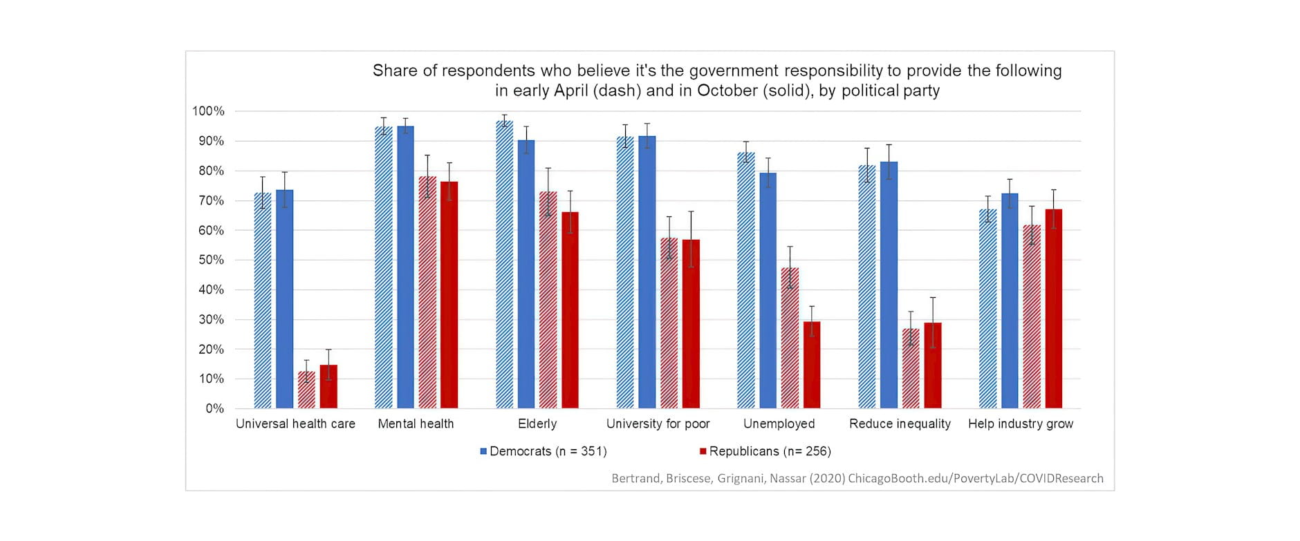 Note: The chart shows the share of respondents who agree or strongly agree with the fact that it is the responsibility of the government to provide for the series of policy interventions. Bars with stripe pattern refer to responses obtained in the first wave of the survey (in the first week of April), while solid bars show the responses from the seventh wave of the survey (third week of October). For easier reference, we omitted responses from Independents in the chart.