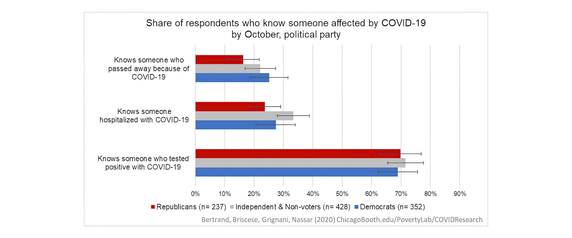 Americans have been exposed to COVID-19 in similar ways, regardless of their income, state, or political party. By October, about 70 percent of Americans report knowing someone who has tested positive and about 1 in 5 Americans knew someone who passed away due to coronavirus.
