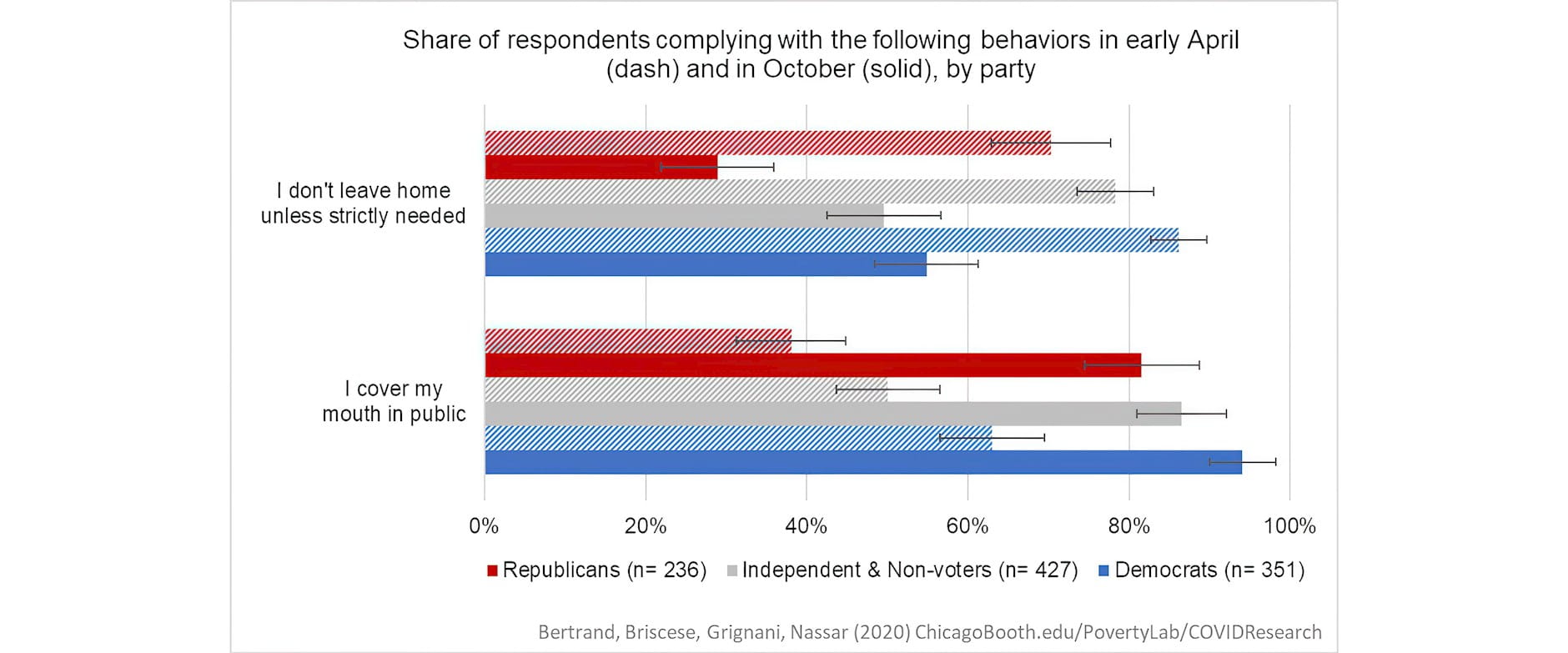 Note: The chart shows the share of respondents who report complying with two preventive measures - not leaving their homes unless strictly needed, and covering their mouths while in public, in early April (dash bars) and October (solid bars). We separate respondents according to their party affiliation.