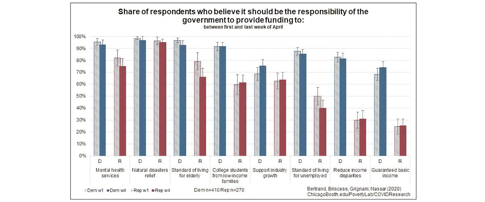 Figure 2. The chart shows the share of respondents who responded “Definitely should be” or “Probably should be” to the question “Do you think the following should or should not be the government’s responsibility to:” across the shown categories. Bars with stripe pattern refer to responses obtained in the first wave of the survey (in the first week of April), while solid bars show the responses from the fourth wave of the survey (last week of April). For easier reference, we omitted responses from Independents in the chart.