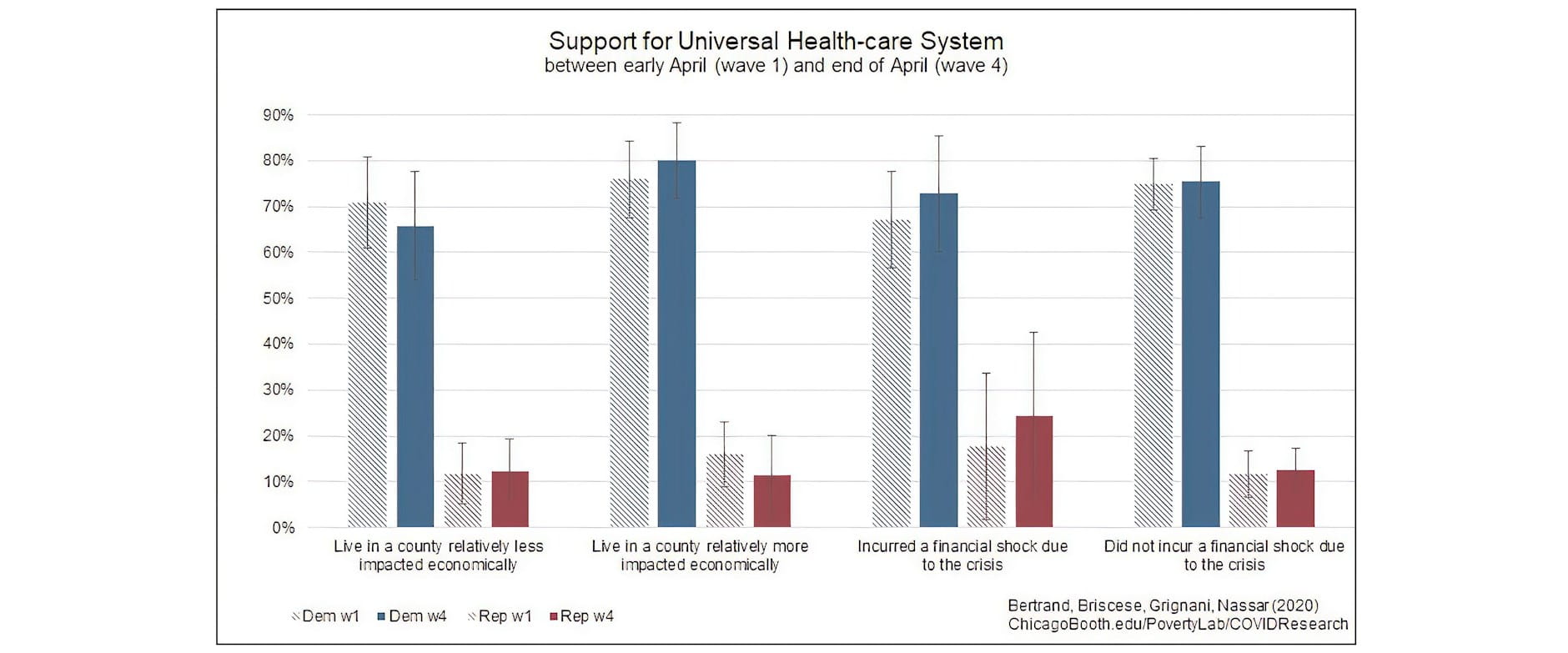 The role of financial shocks in supporting a Universal Health-care System. We find that respondents who have incurred a financial shock are more likely to have increased their support for a universal health-care system, regardless of the political party, although not in a statistically significant way (from 67 percent to 73 percent among Democrats and 18 percent to 24 percent among Republicans within this group). Living in an area that was more economically affected increased support among Democrats but not among Republicans (from 76 percent to 80 percent and from 15 percent to 11 percent, respectively).