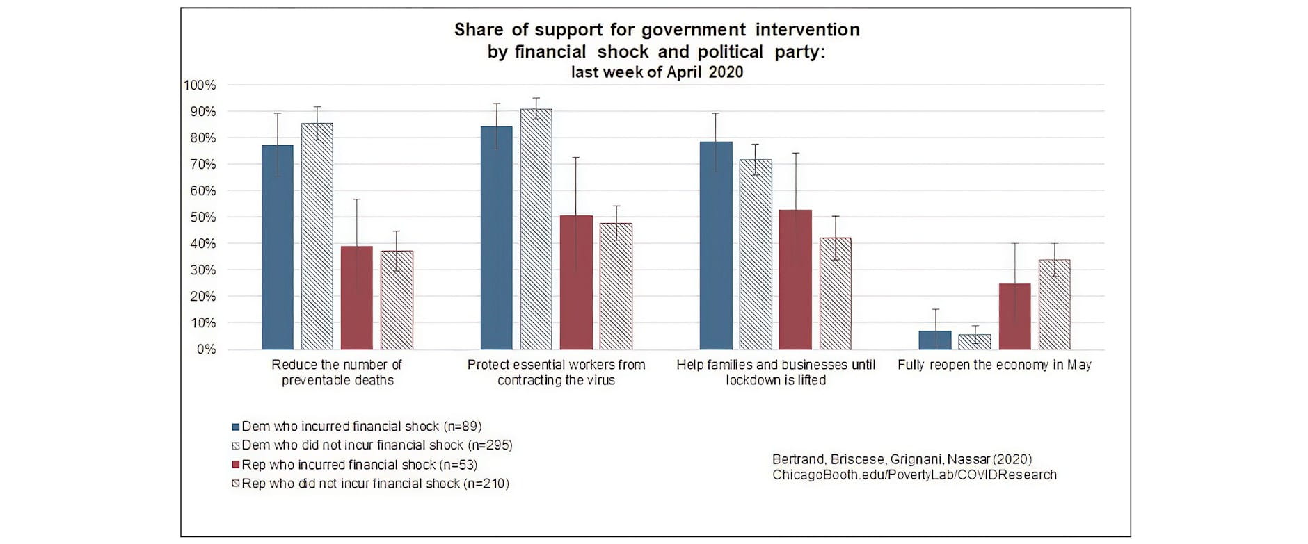 support for the role of government in the economy. Changes in support for government interventions are driven by political identity and media consumption, rather than personal experiences with the virus or the economic crisis.