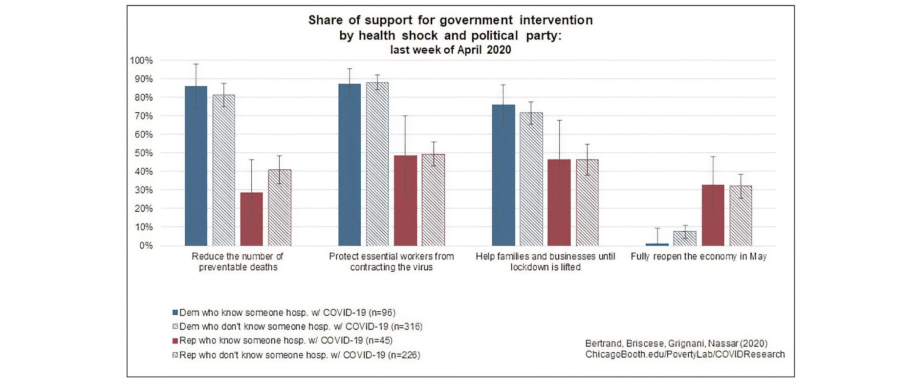 The wealth of data we have collected since April allows us to disentangle the many types of shocks respondents have lived through, including whether they suffered a financial shock, whether they know anyone hospitalized with COVID-19, or if they live in an area that has recorded a high number of