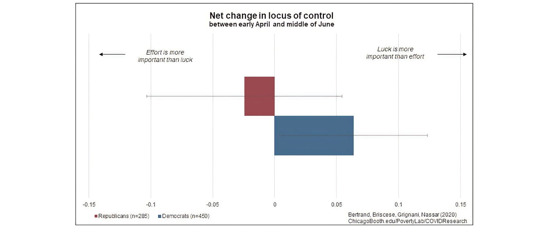 As in the General Social Survey (GSS), we asked respondents in early April (wave 1) and again in the middle of June (wave 6) whether they believed that success in life is mainly due to luck, efforts, or both. We find that, over a period of just 10 weeks, Democrats and Independents have decreased their internal locus of control, whereas the opposite is true among Republicans. While at the beginning of the crisis, 45 percent of Democrats believed that success was due to hard work, that share decreased to 41 percent by the middle of June, compared to 71 percent and 73 percent of Republicans. In a series of regression analyses, we find that having undergone a financial setback, and residing in a county that has witnessed a large increment in deaths significantly increased the chances of shifting towards believing that luck plays a larger role in influencing success in life.