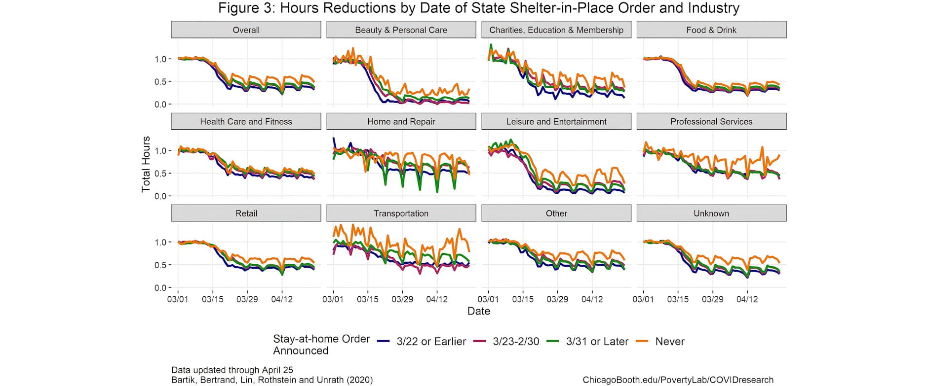 Figure 2 investigates how hours reductions vary by firm industry. We see that reductions in hours are largest in Beauty and Personal Care and Leisure and Entertainment, where hours have declined over 90 percent. Hours declines are smallest in industries like Home and Repair and Transportation. However, even in these industries hours have declined by around 50 percent. Broadly, the magnitudes of industry-level job declines appear to closely map the extent to which an industries’ workers are “essential” according to government social distancing orders, and whether consumption requires in-person interaction (i.e. whether remote work is possible).