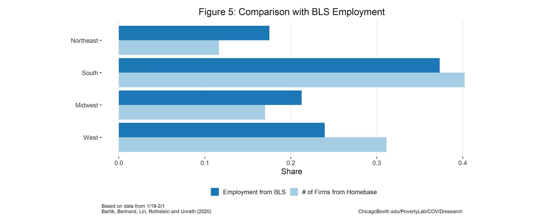 Broadly, the patterns remain similar as before. We’ve added additional figures, 5 through 7, that provide information on three characteristics of the firms in the Homebase data: the regions they are located in, the industries they operate in, and the number of employees they