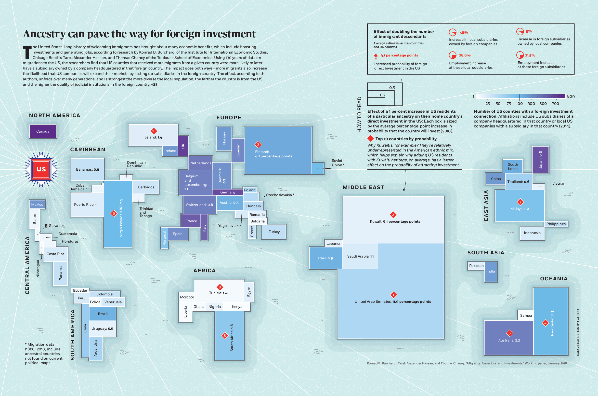 The region-by-region maps below illustrate how immigration from countries around the world has affected foreign direct investment between those countries and the US.