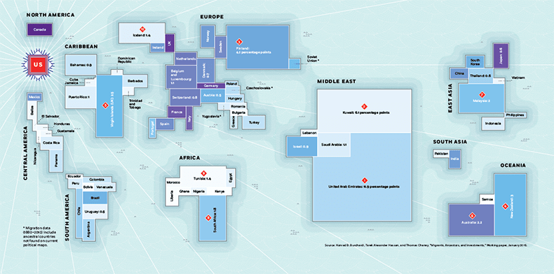 The size of a country's box represents the effect of a 1 percent increase in US residents of a particular ancestry on their home country’s direct investment in the US (2010).