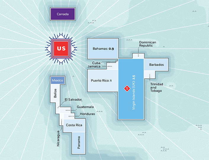 The color of a country's box represents the number of US counties with which it shares a foreign investment connection. Those connections include US subsidiaries of a company headquartered in that country or local US companies with a subsidiary in that country (2014).