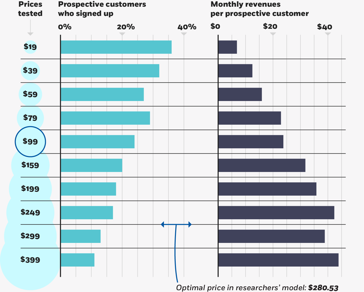 In the first month, the researchers observed, doubling the price from $99 to $199 resulted in some customer loss: a quarter of customers whom the company surmised probably would have paid the $99 price declined to subscribe at the higher price. But because every customer brought in more profits, revenues still increased 14 percent, which suggested to the researchers that ZipRecruiter had been undercharging. The results indicated that ZipRecruiter could increase profits by moving to a higher price, and the researchers calculated that the optimal price was between $249 and $399.