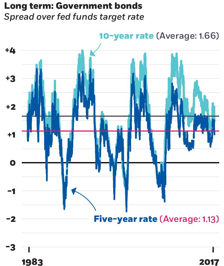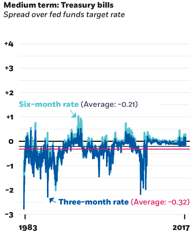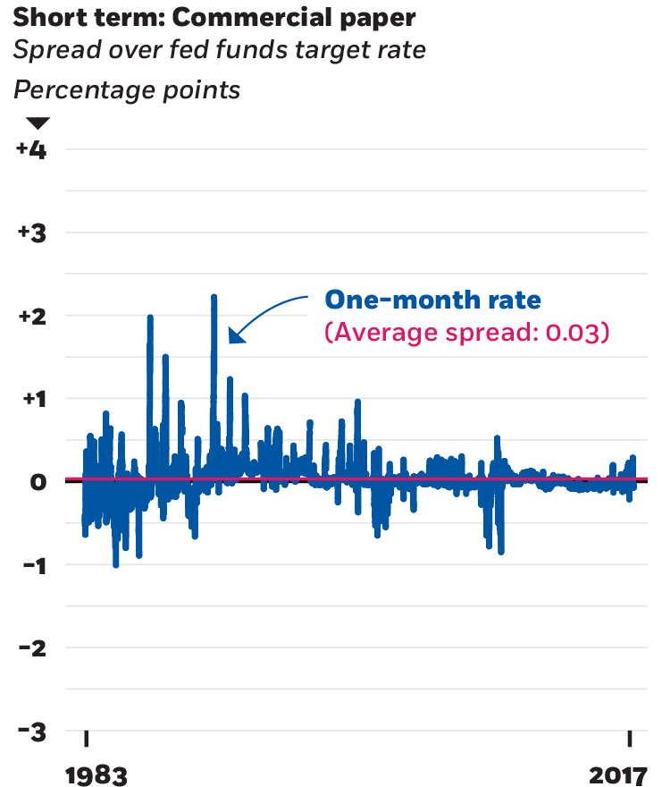 The commercial paper rate stays fairly close to the fed funds target rate. But once rates extend to months, as with Treasury bills, or years, as with government bonds, the Fed’s target rate holds less sway.