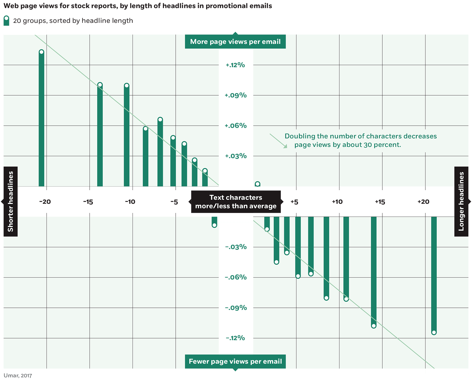 Less is more when it comes to the length of headlines, according to research by Chicago Booth PhD candidate Tarik Umar. Using email alerts from a popular website for investors, the research suggests that the shortest headlines get the most clicks, and longer headlines produce diminishing results