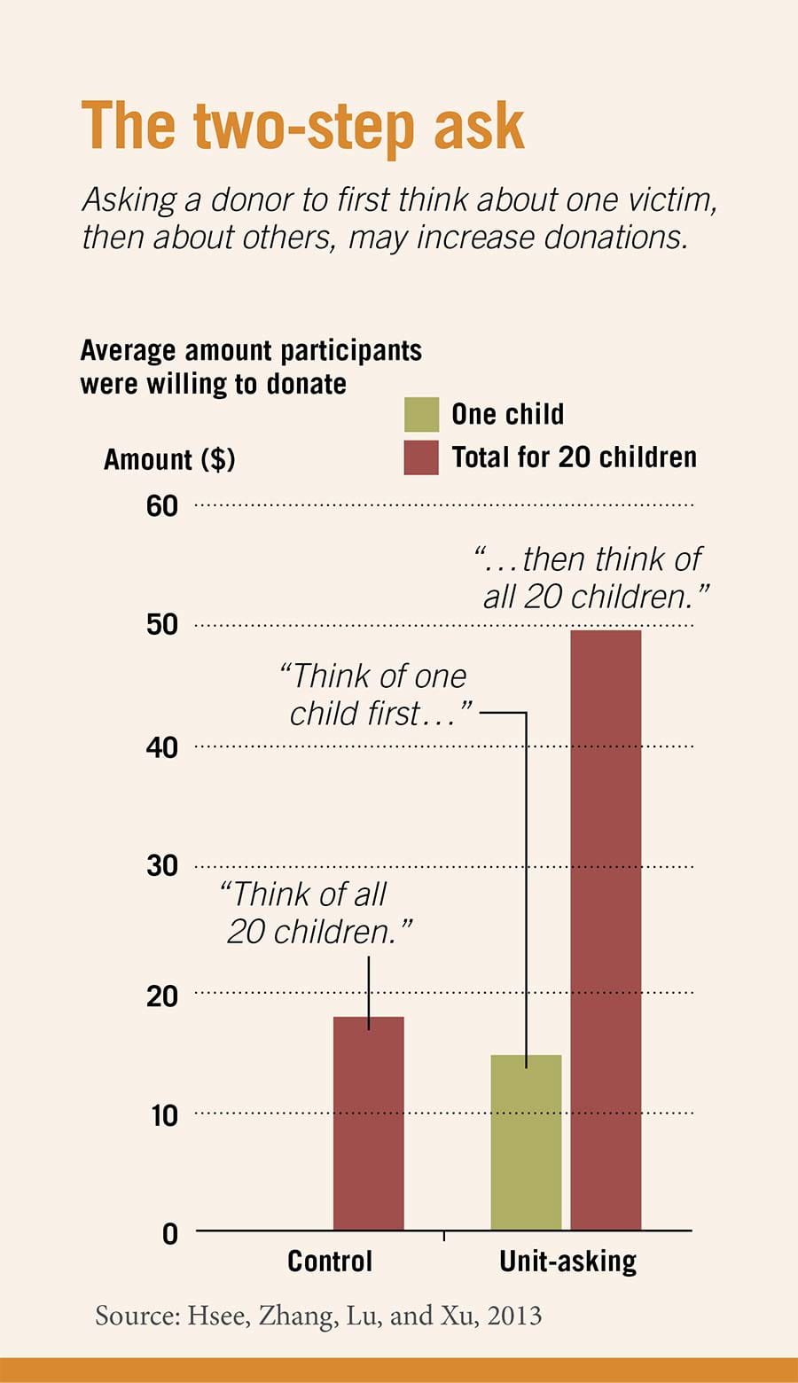 Experiments suggest this two-step approach has a big impact. The researchers asked participants in one study to imagine being solicited to help a school buy Christmas gifts for the children of low-income families. When they asked participants to consider how much they’d give to the entire group of children, the participants gave $18, on average. But when researchers asked participants to first consider how much they would donate to one child before considering the class as a whole, donations rose to an average of $49.