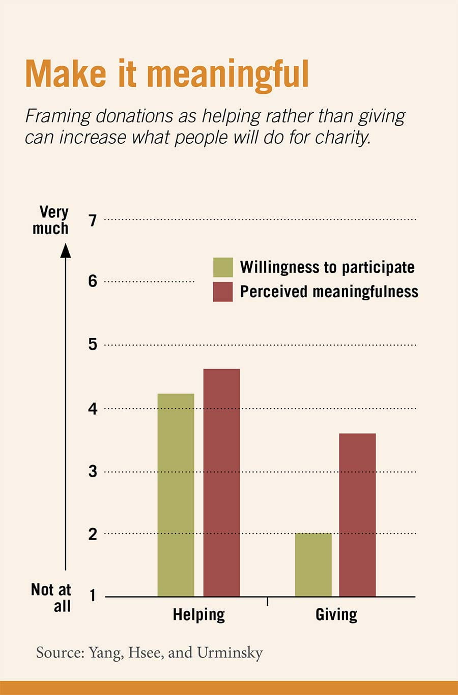 These findings support a fund-raising strategy different from the “pennies-a-day” strategy, which encourages people to give a very modest amount on a daily basis, rather than a larger amount all at once. This daily breakdown works well when the total can be divided into small amounts that people essentially round to zero, says Sussman. But it is generally ineffective for larger sums. For those, framing the donation as a one-off occurrence may be more productive.