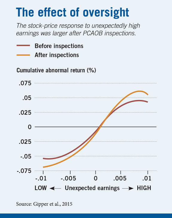 - They find that investors reacted more strongly to earnings surprises following government inspections of public companies’ audit firms. The stock-price response to high unexpected earnings was larger after PCAOB inspections than before inspections were carried out (see chart).