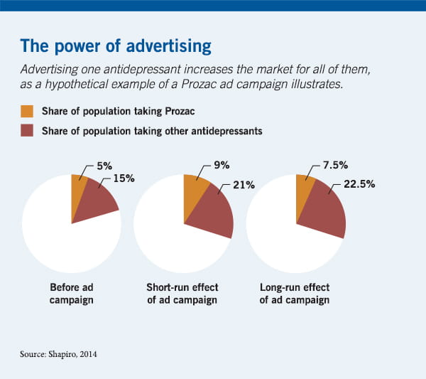 In the short run, Prozac’s share of the antidepressant market rises to 30 percent. Now, 9 percent of people take Prozac. But that effect dissipates quickly, Shapiro explains. In the long run, Prozac’s market share may fall back to 25 percent. But thanks to the advertising, the overall market for antidepressants has expanded—with Prozac’s share translating to 7.5 percent of the population. “There is a sustained effect on Prozac, but it is only coming through the effect on the category as a whole,” Shapiro says.