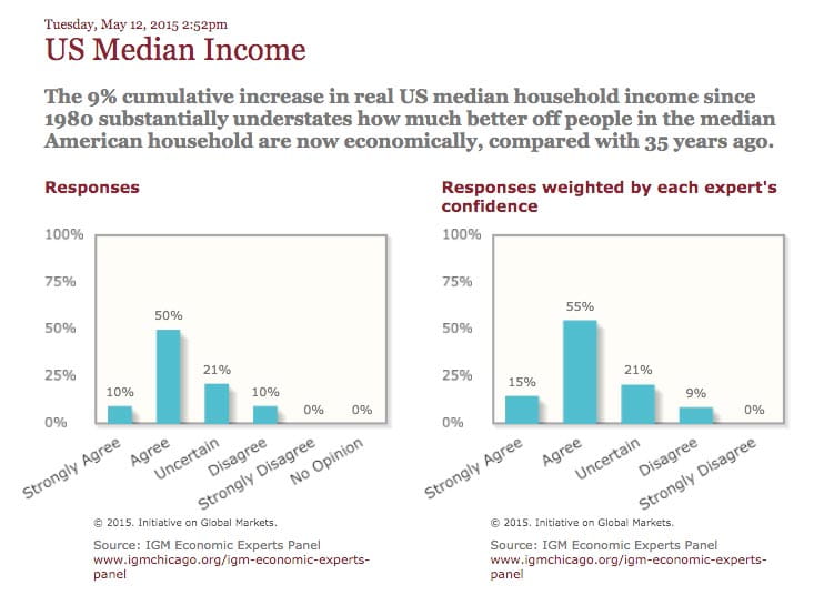 Sixty percent of the panelists either agreed or strongly agreed that the figure understates household well-being, pointing to the goods and services available now that were the stuff of science fiction a few decades ago. “So much of our day is spent doing things that didn’t exist back then,” wrote Austan Goolsbee of Chicago Booth, “that it’s hard to believe the #s fully account for new products.” In addition to technological advances, panelists cited medical breakthroughs and better air quality as evidence of a higher quality of life.