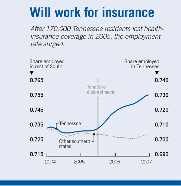 The study finds a large increase in employer-provided health-care coverage in Tennessee after the Medicaid changes, “suggesting that public health insurance had been ‘crowding out’ private health insurance,” the researchers write. Childless adults were especially likely to report such a switch to private insurance.