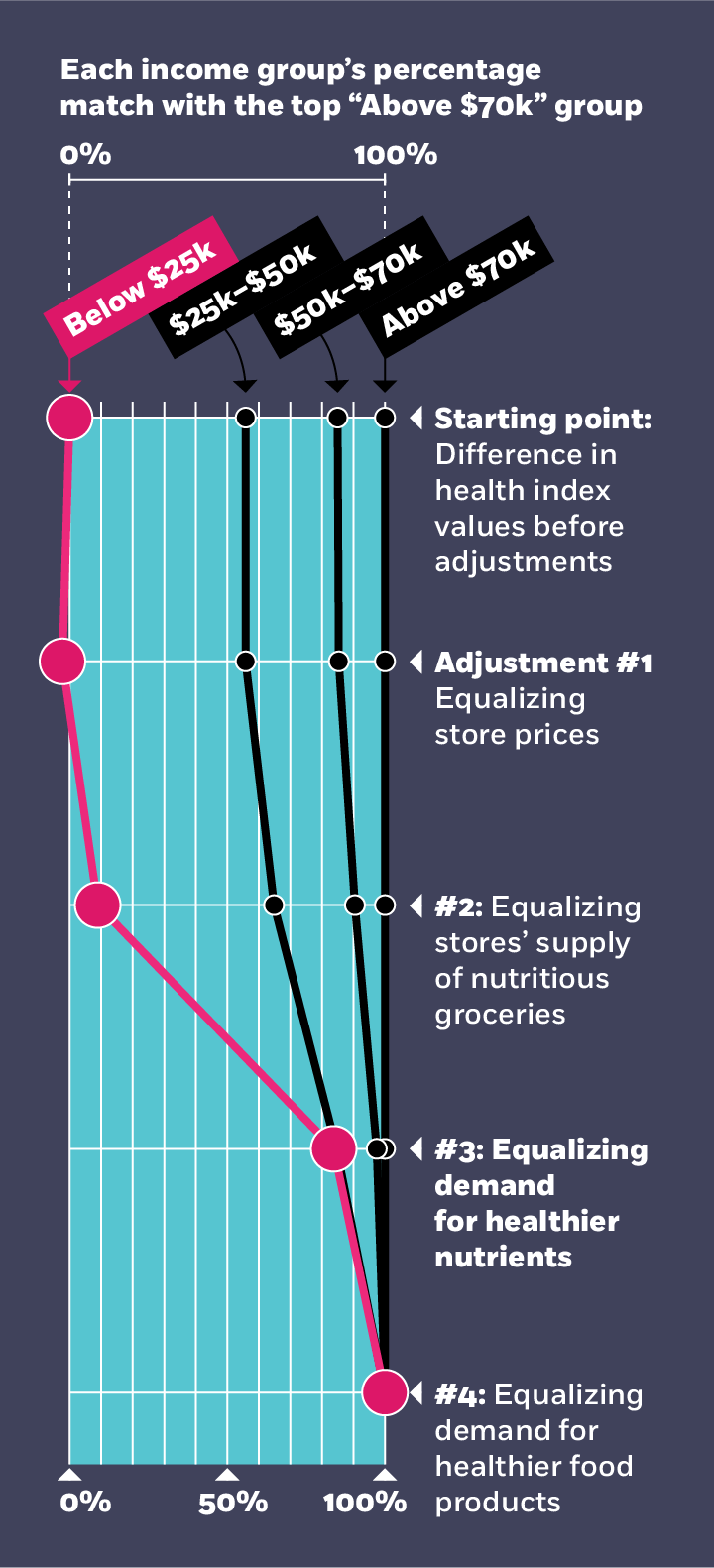 Demand-side factors rather than supply-side factors explain most of the nutrition gap between lower- and higher-income households. A counterfactual analysis finds that if everyone had the same access to healthy food, with the same prices, the nutrition gap would narrow by 9 percent. But if everyone shared the same food and nutrient preferences, the gap would shrink by 91 percent.