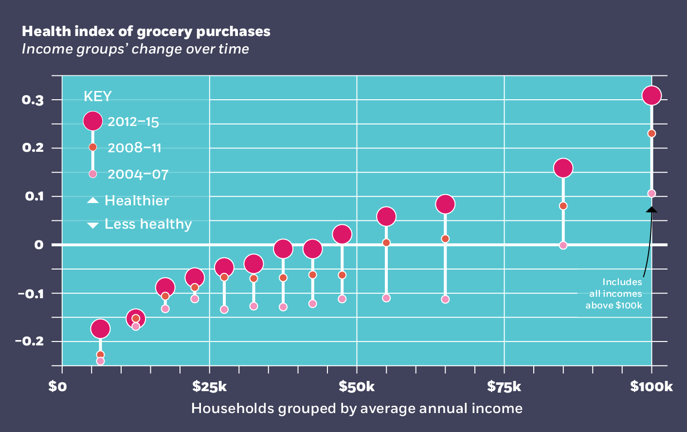 Lower-income households buy more foods that are sugary and less that are notably healthy, such as whole-grain breads, compared to households with higher incomes. The researchers’ health index, an overall measure of household groceries’ nutrition content, shows that not only did higher-income groups make healthier purchases, but they also improved their health scores at a greater rate in recent years.