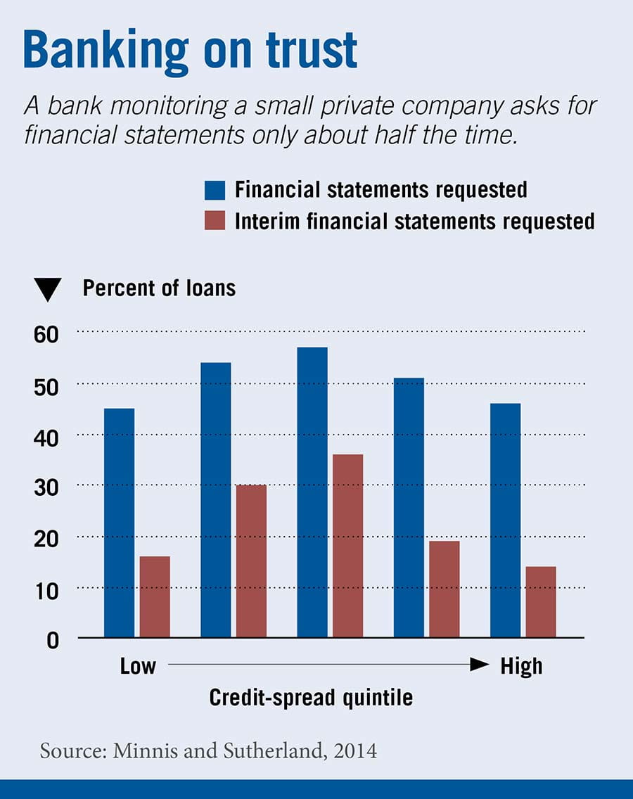 The researchers find that a bank's decision about whether to request a borrower's financial statements depends on five things: the bank-borrower relationship, the loan's credit spread (the difference between the interest rate on the loan and the prime rate), the presence of collateral, the availability of alternative information sources, and other loan contract terms.
