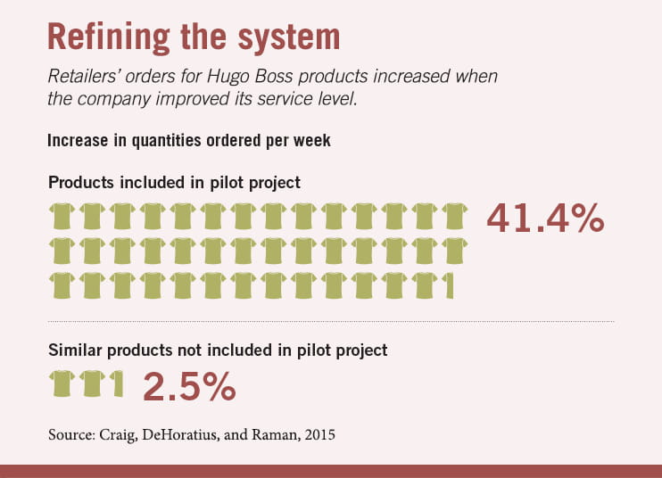 Improving service had a big impact on demand from retailers. When Hugo Boss improved its inventory service level by just 1 percent, retailers increased their average weekly orders by 13 percent. The project generated an additional €300,000 in profit margin for the items in the pilot, which substantially exceeded the costs of the project.