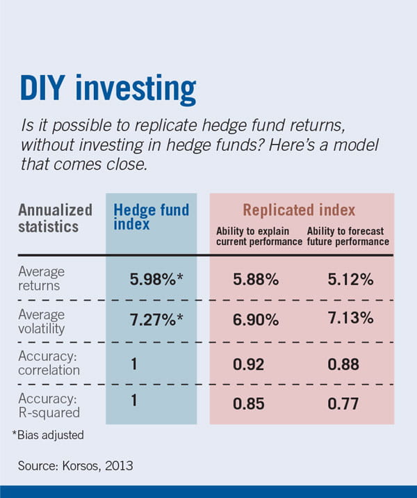 Hedge funds, which held more than $2.375 trillion in capital as of March 2013, have become the investment vehicle of choice for many sophisticated investors. The funds have a reputation for outperforming other investments while offering greater protection during market downturns. But these benefits also come with a downside: hedge funds are opaque, offering very little information about what they invest in. In addition to that, investors in hedge funds often pay high fees, ante up hundreds of thousands of dollars to meet investment minimums, and commit to leaving their money in the hedge fund for months or years. Can investors get hedge fund returns without the downsides?