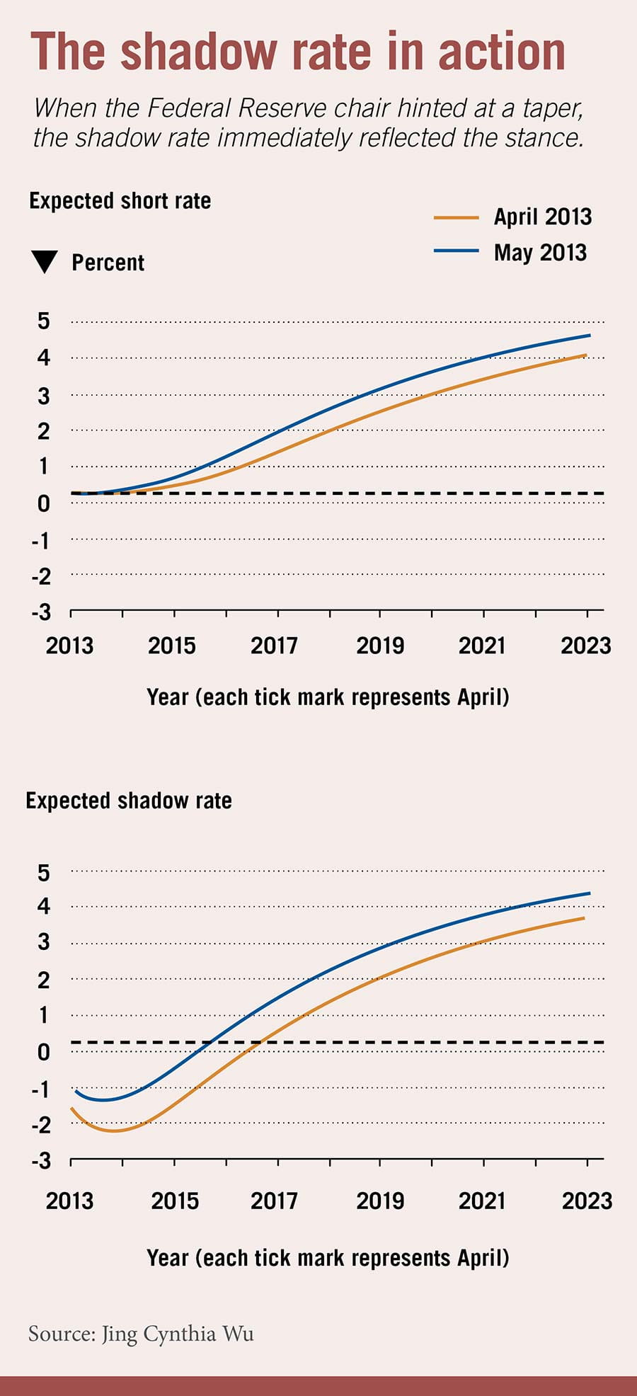 Just like the federal funds rate demonstrates the stance of monetary policy, the shadow rate demonstrates the stance of unconventional monetary policy, Wu says. On May 22, 2013, then–Federal Reserve Chairman Ben Bernanke told Congress that the Fed was discussing slowly tapering its asset-buying program. According to the researchers’ calculation, the shadow rate initially spiked, then fell back as Bernanke further explained that the taper would not signal monetary tightening. Further decline in the shadow rate suggests that Bernanke’s message had an effect on interest rates, which could have a broad effect on the overall economy.