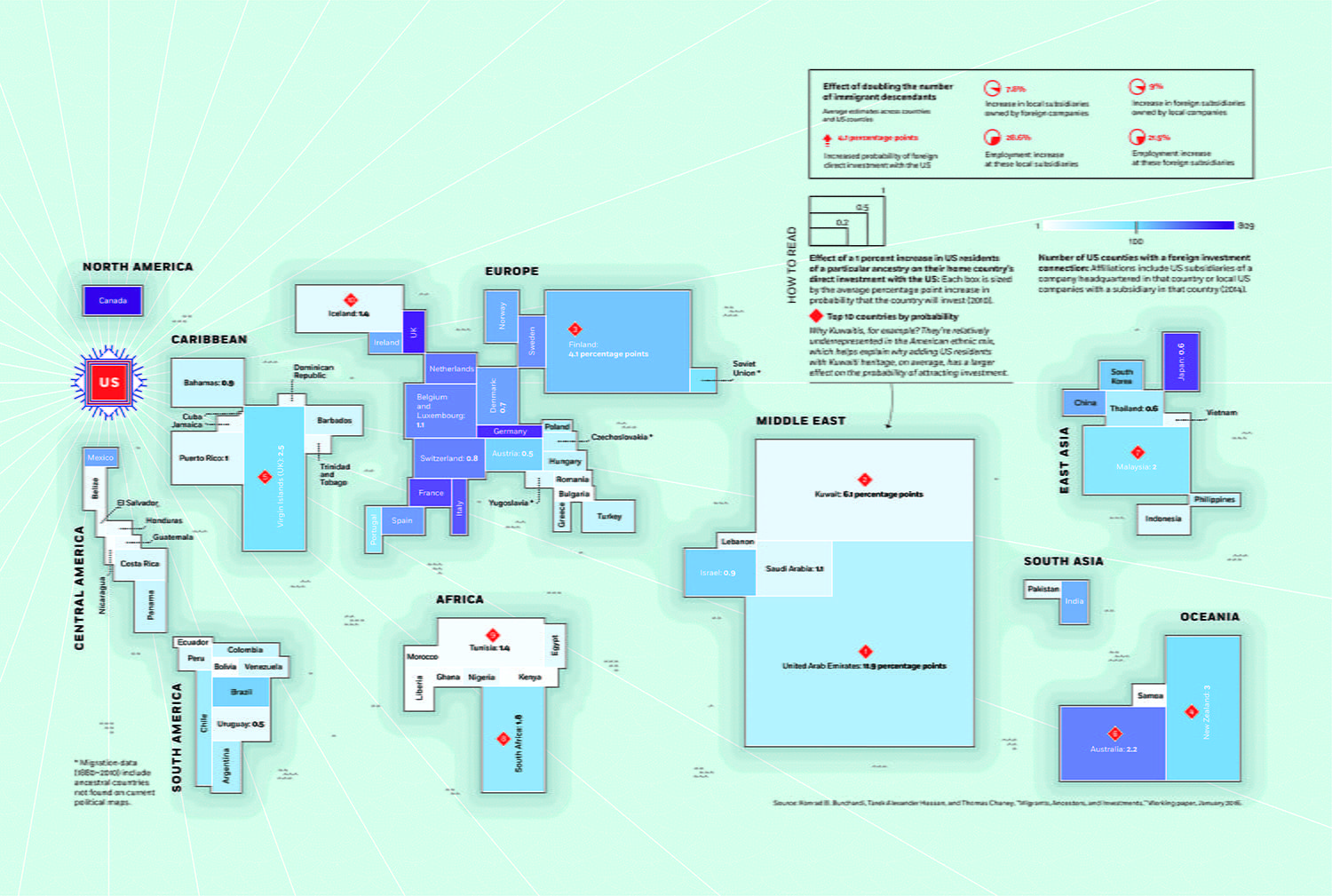 Our friends at Calibro studio turned the data into a stylized global map. They sized each country according to the likelihood that a wave of migrants to the US would attract investment, then applied a color scale to show the proliferation of the country’s investment connections in the US.