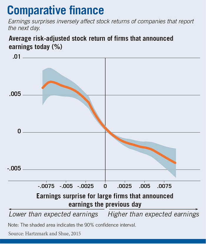 Earnings surprises inversely affect the level of returns of shares in companies that report the next day, according to research by Chicago Booth’s Samuel Hartzmark and Kelly Shue. For example, say Company A released earnings on Monday that greatly exceeded analyst forecasts. Regardless of what Company B reports for earnings on Tuesday, B’s returns will be lower than they would be if Company A had instead released a surprisingly negative report.