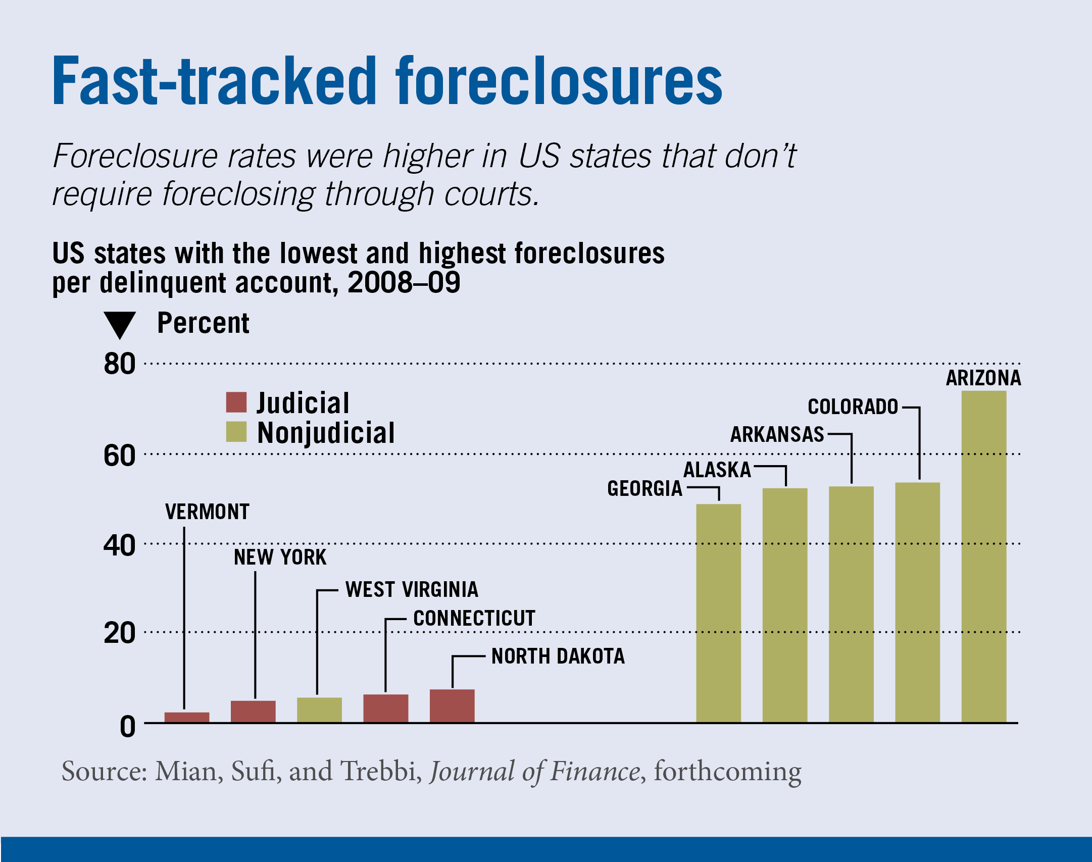 Some 21 US states allow banks to foreclose on delinquent homeowners without first suing them in court, a concession that lets lenders bypass the costlier and lengthier legal process required elsewhere. Now research finds that states endorsing such shortcuts suffered an inordinate amount of economic damage at the height of the recent recession.