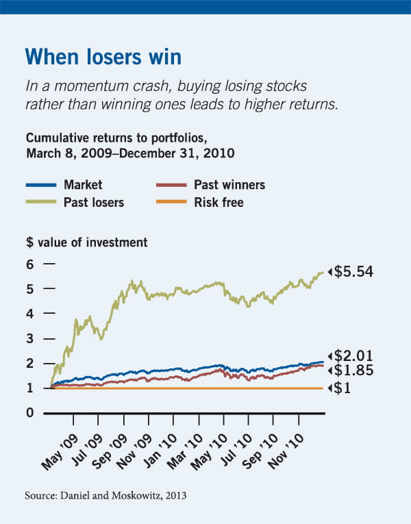 Those crashes predominantly occur at pivotal points in the economy, when a bear market suddenly ends and stocks dramatically rebound. In such environments, last year’s losers perform magnificently, while winners lag dramatically—the opposite of what a momentum trader would be betting on. Chicago Booth’s Tobias J. Moskowitz and Kent D. Daniel of Columbia Business School attribute these setbacks to the effect of the stocks’ beta, or exposure to the market: when you buy winners and sell losers, you are picking stocks that are more sensitive to overall market swings.
