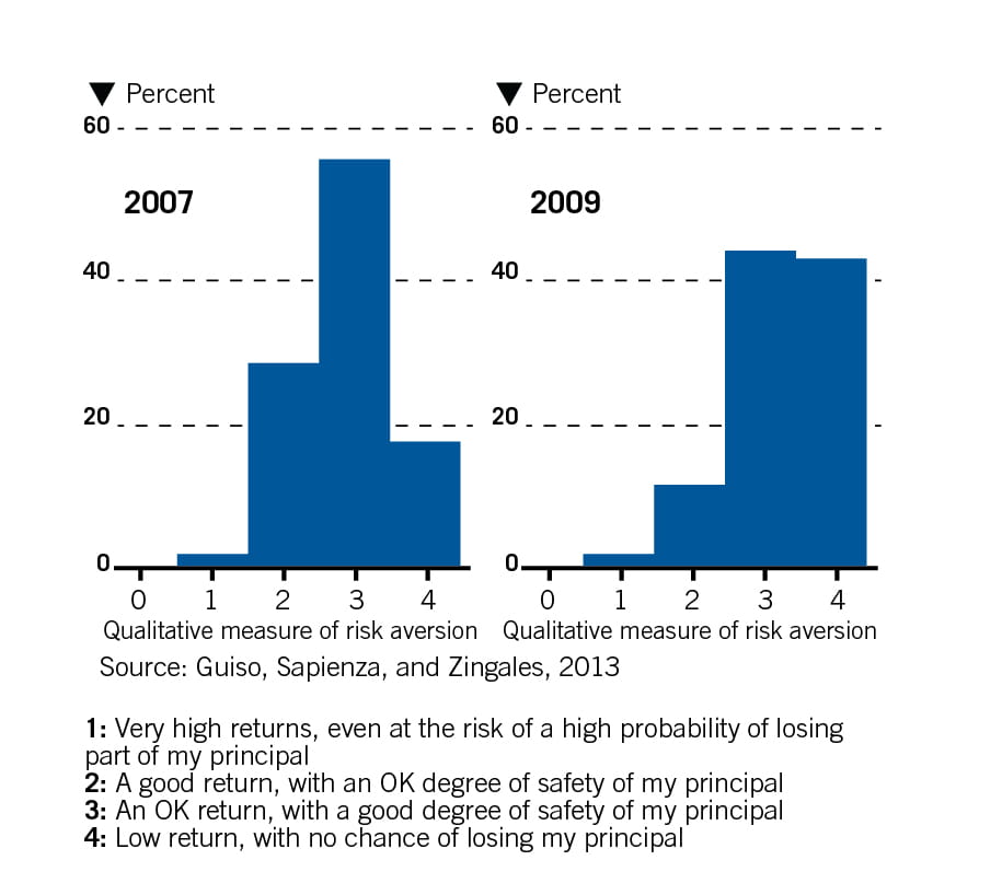 On a scale of 0 to 4, where 4 indicates the highest level of aversion to risk, the qualitative measure of risk aversion jumped from 2.85 before the crisis to 3.28 during the crisis. The researchers find that none of the standard reasons for rises in aversion to risk, such as changes in wealth, spending habits, or background, can explain the increase.