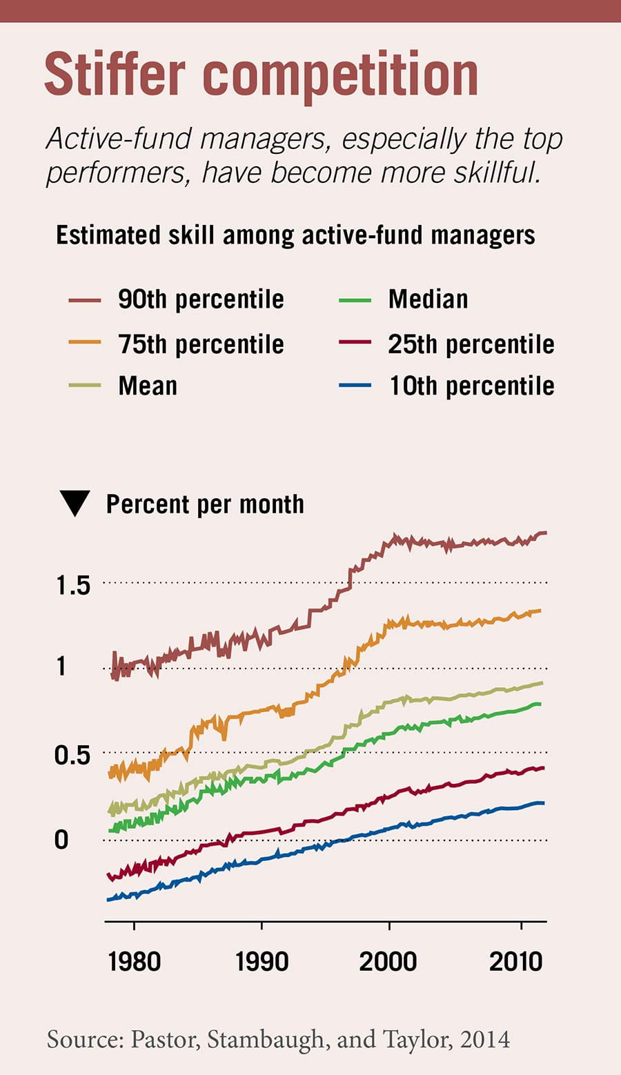 Yet there is no shortage of money managers who claim they can beat market benchmarks, some with impressive track records. And one stream of research suggests that some people can identify and profit from mispriced securities in the stock market. Lubos Pastor, Charles P. McQuaid Professor of Finance at Chicago Booth, believes that money managers are not only skilled, but becoming ever more skilled over time. So should you dump your index funds and buy actively managed ones? Not so fast.