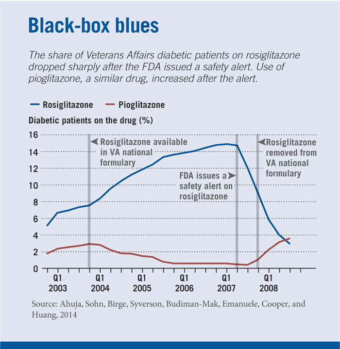 They find that at the aggregate level, rosiglitazone use peaked just prior to the first FDA safety alert, when it represented 14.8 percent of the total prescriptions for diabetes. VA clinicians responded swiftly to both the first safety alert and the black-box warning, with drug use dropping 80 percent to a 2.9 percent share by the end of the study period.